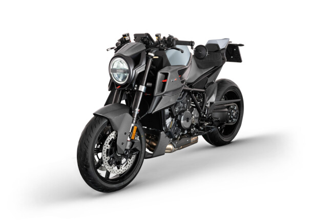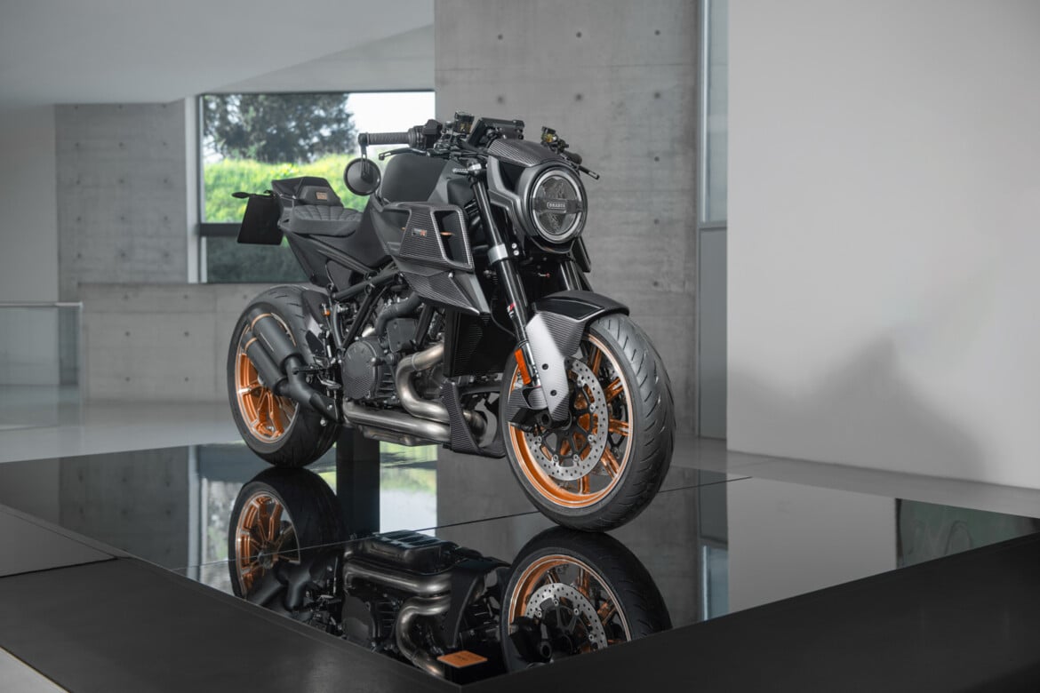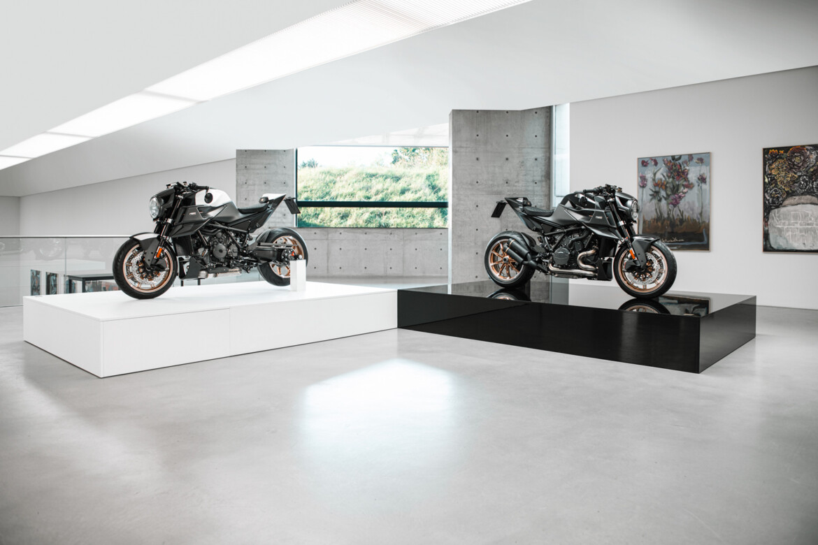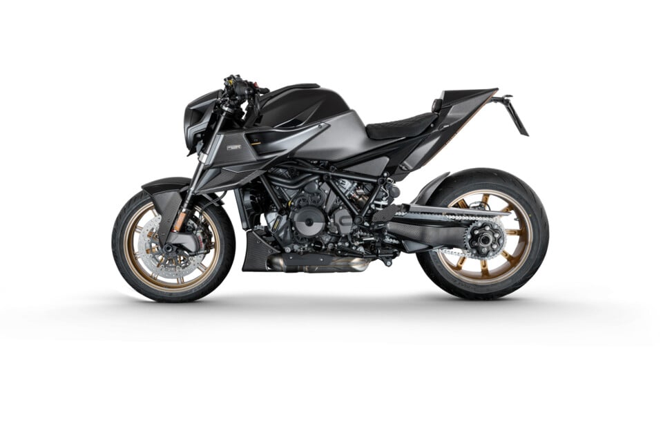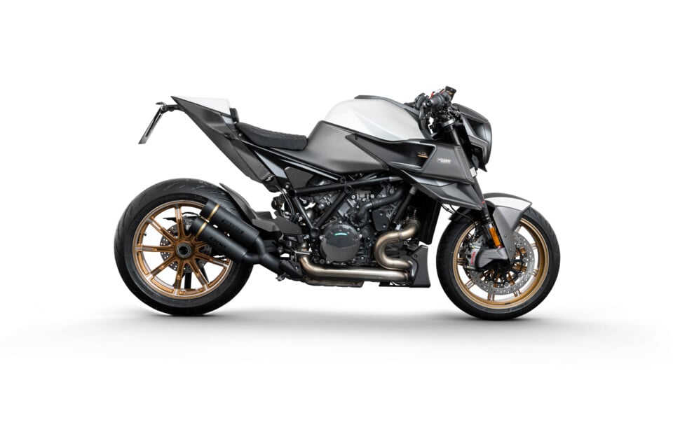 Sharing the same technology platform as its predecessors, the BRABUS 1300 R Masterpiece Edition is equipped with the KTM 1290 SUPER DUKE R EVO’s 1,301 cc V-Twin engine producing 180 hp at 9,500 rpm and 140 Nm of torque at 8000 rpm. As the benchmark of V-Twin evolution, this high-end configuration offers excellent power delivery – designed for enthusiasts. The dual-pipe slip-on exhaust developed specifically for the BRABUS 1300 R Masterpiece Edition underscores its BRABUS typical bold looks as well as the aggressive sound of its sporty V-Twin symphony. For an extra touch of exclusive elegance, the reimagined design features two accent rings in “Frozen Gold”.