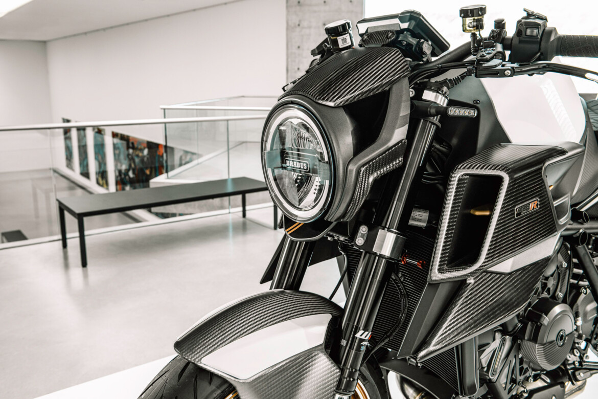 For the first time, this limited edition naked bike features an all-new carbon fiber package – including the cover for the single-sided swing arm, dash and connector covers as well as the cover for the rear side fairing. But that’s just the beginning. The BRABUS 1300 R Masterpiece Edition’s striking bodywork is further defined by a range of returning highlight features, such as the distinctive round headlight mask, complete with carbon fiber side fairing, power domes as well as BRABUS Signature Stripes in the air scoop. The carbon fiber air-ducts are a further testament to decades of experience in processing prepreg carbon as well as a dedication to stylish weight reduction.