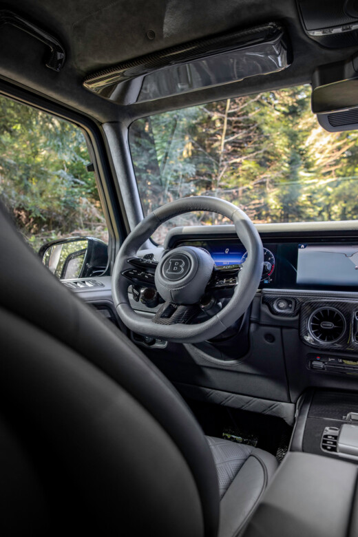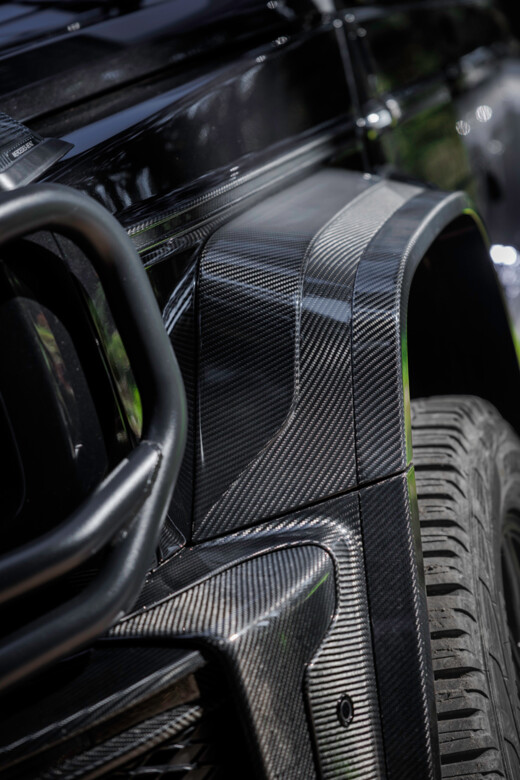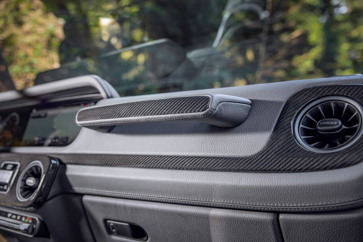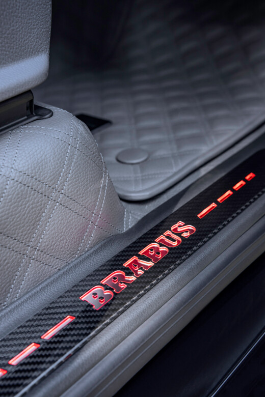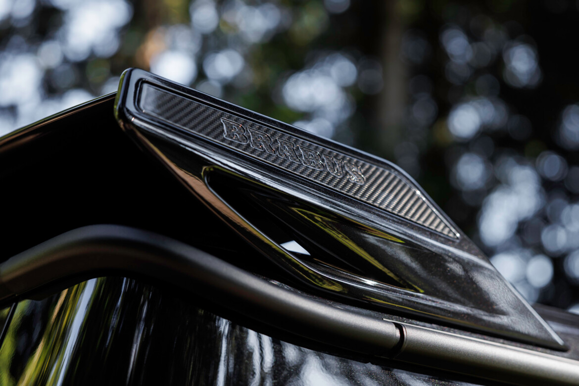 Auf beiden Fahrzeugseiten setzt sich das BRABUS Carbon-Paket mit Aufsätzen hinter den vorderen und hinteren Radläufen genauso fort wie mit den Seitenleisten und den Spiegel-Covern aus Sicht-Carbon. Um das Offroad-Supercar leichter und sicherer entern und wieder verlassen zu können, gibt es spezielle, elektrisch ausfahrende BRABUS Trittstufen: Ein weiteres Komfortfeature sind die speziellen BRABUS „Easy Entry“ Scharniere, mit denen sich die hinteren Türen bis zu 90 Grad weit öffnen lassen und somit den Fondpassagieren einen bequemeren Zu- und Ausstieg ermöglichen.