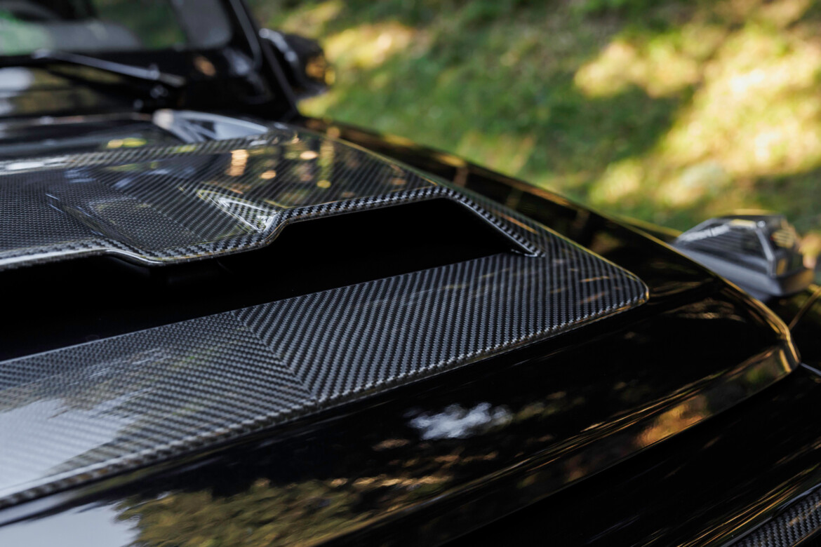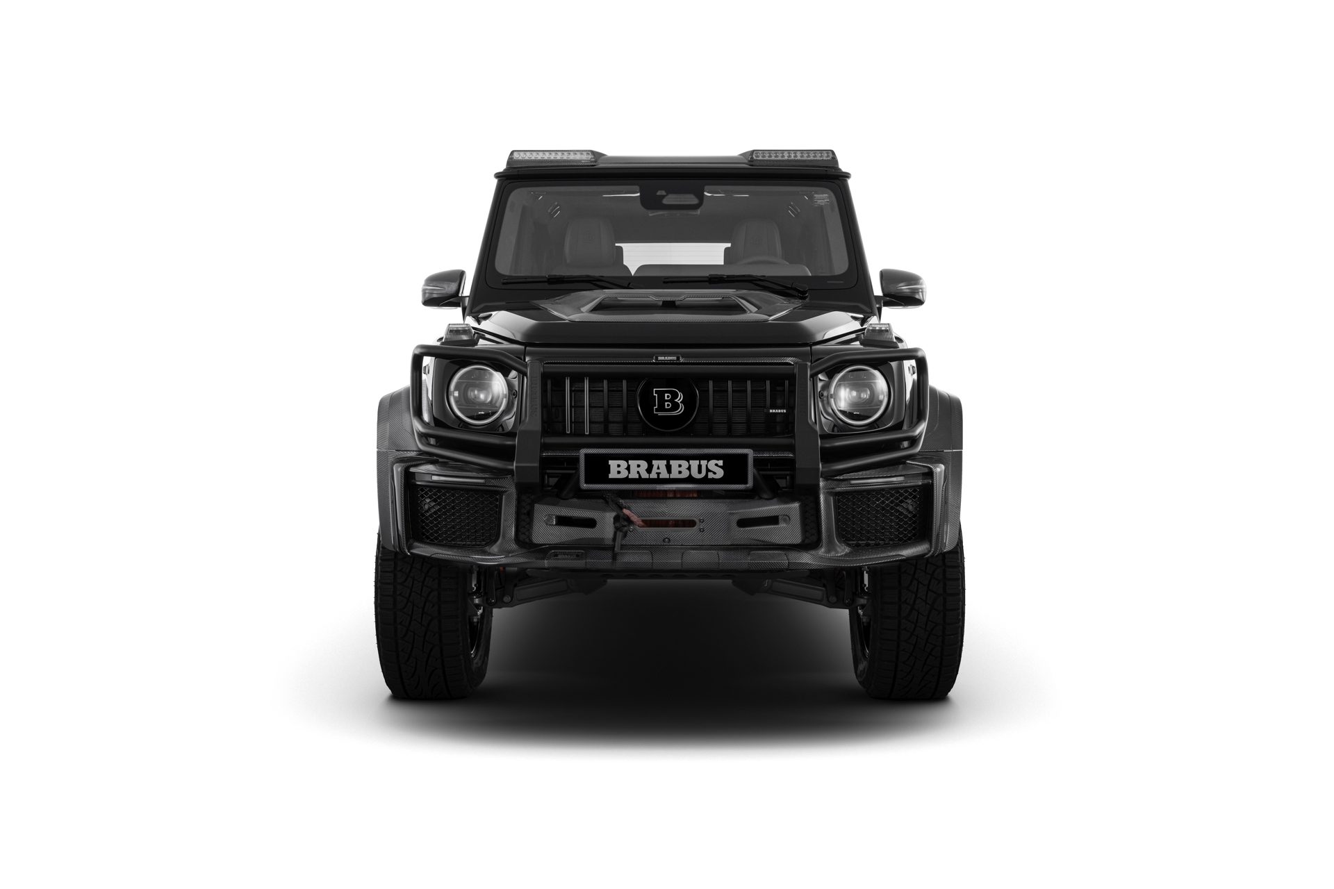 Das unverkennbare BRABUS Gesicht wird zusätzlich durch die Sicht-Carbon-Einfassung für den Kühlergrill und die BRABUS Powerdome-Motorhaube geprägt. Ein weiteres optisches Statement ist der Sicht-Carbon-Windabweiser über der Frontscheibe. Seine integrierten, besonders leistungsstarken LED-Leuchten helfen dem Fahrer oder der Fahrerin bei Dunkelheit, das Terrain optimal im Blick zu haben.