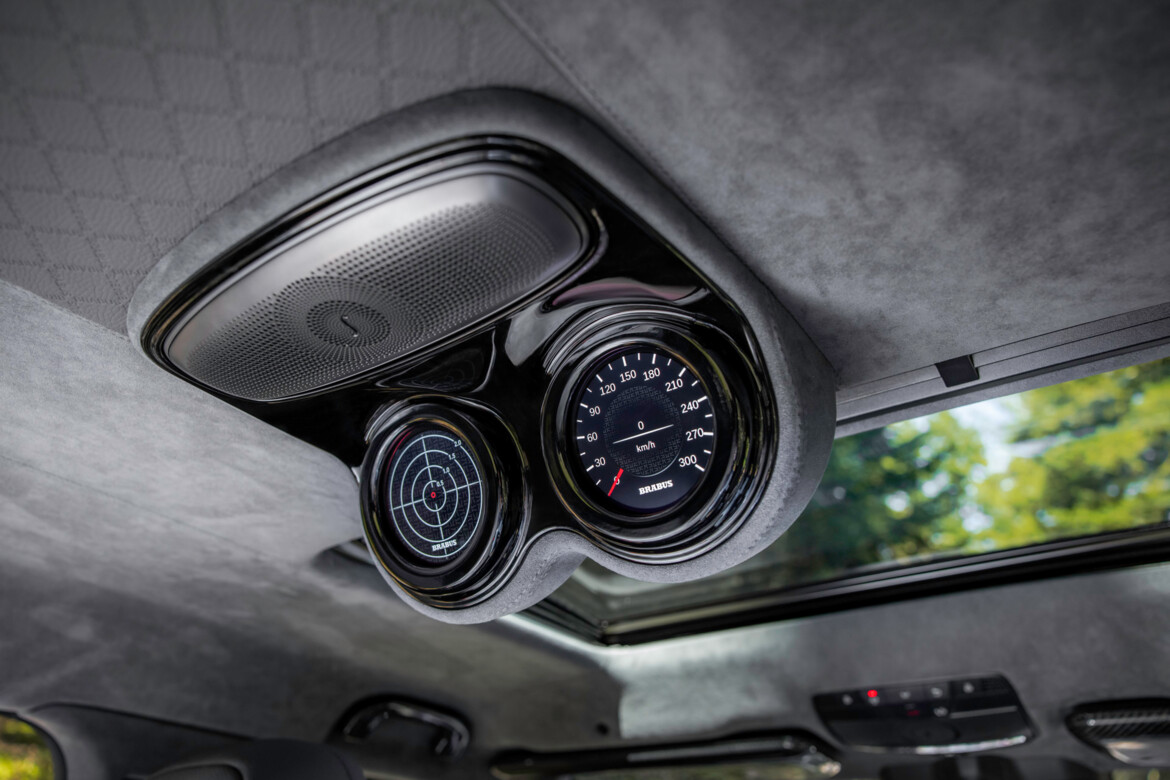 Sicht-Carbon-Elemente an Instrumententräger, Türverkleidungen und Mittelkonsole betonen den High Performance Charakter dieses Fahrzeug genauso wie die Türverriegelungsstifte aus Aluminium und die Carbon-Pedalauflagen. Aus dem gleichen Hightech-Compound gefertigt sind die Türeinstiegsleisten mit beleuchtetem BRABUS Logo, das seine Farbe analog zur Ambientebeleuchtung des Fahrzeugs wechselt. Eine neue, besonders sportliche Note erhält der BRABUS XL 800 mit den Sicht-Carbon-Sonnenblenden und der Dachinstrumentenkonsole, die die Passagiere auf den Rücksitzen über die gefahrene Geschwindigkeit, Uhrzeit und Datum auf dem Laufenden hält.