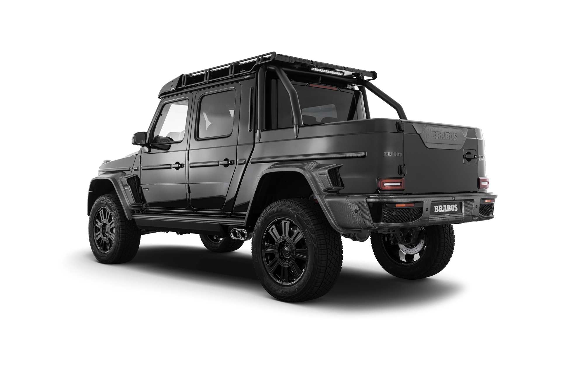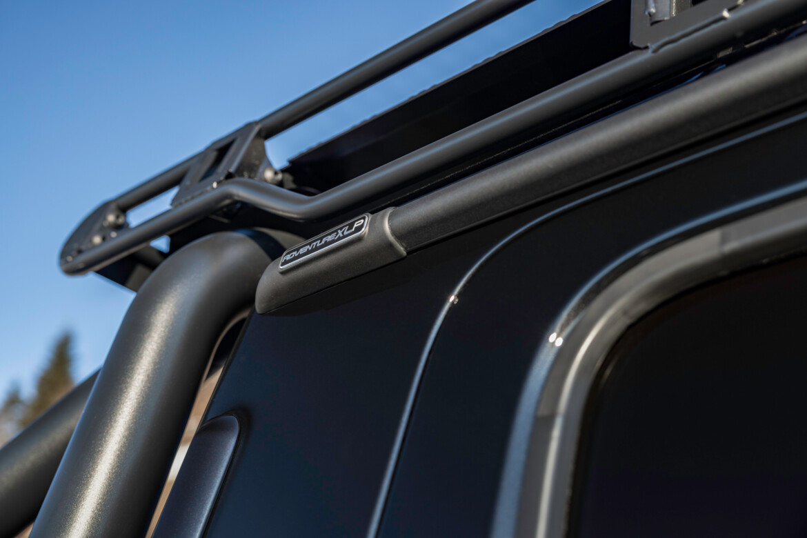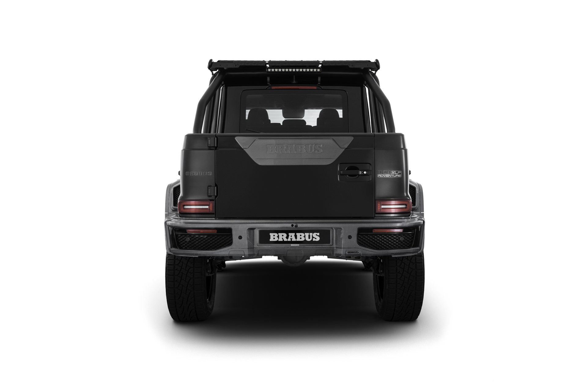 Für das Pickup-Heck wurden ein spezielles, hochfestes Rahmenergänzungsmodul und eine längere Kardanwelle entwickelt. Sie ermöglichen es, die Hinterachse zurückzuversetzen und damit den Radstand um 50 Zentimeter zu verlängern. Damit erreicht der BRABUS XLP 800 ADVENTURE eine Länge von über fünf Metern. Zur Karosserie gehören außerdem der doppelte Bügel hinter der Kabine und der ebenfalls mattschwarz beschichtete, robuste ADVENTURE Dachgepäckträger, für den als Option auch ein Dachzelt angeboten wird.
