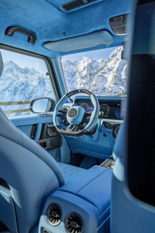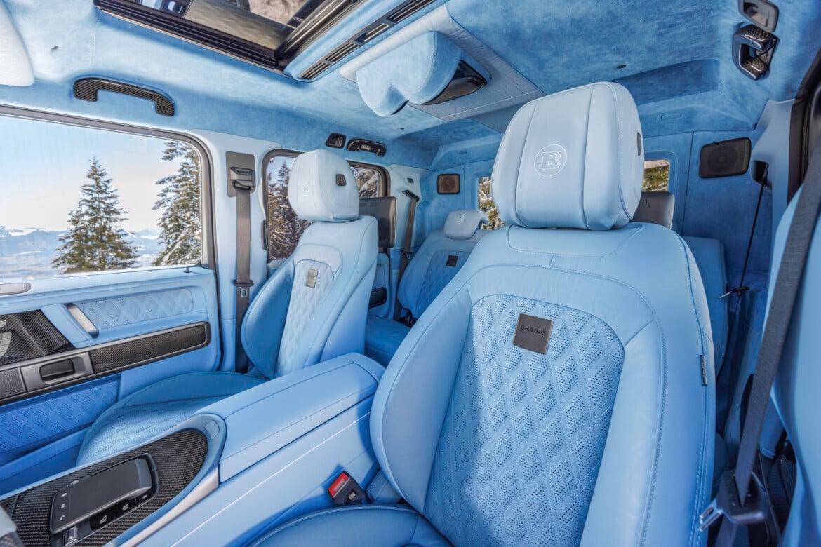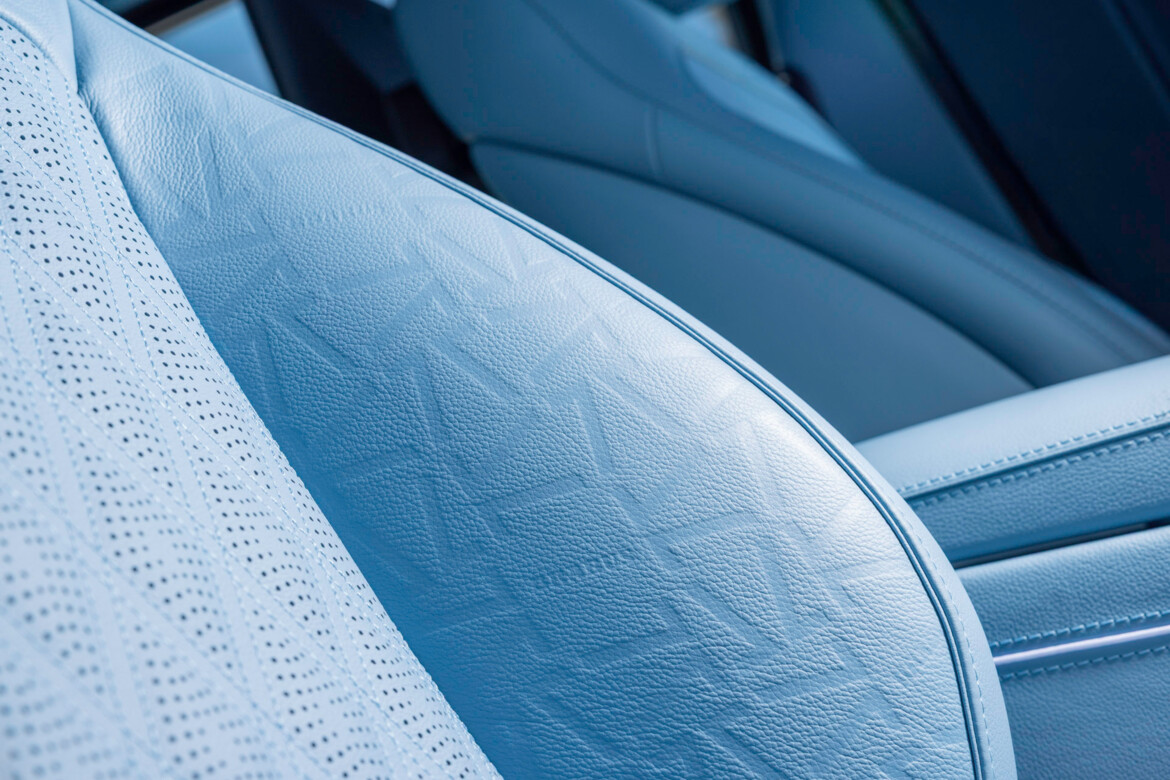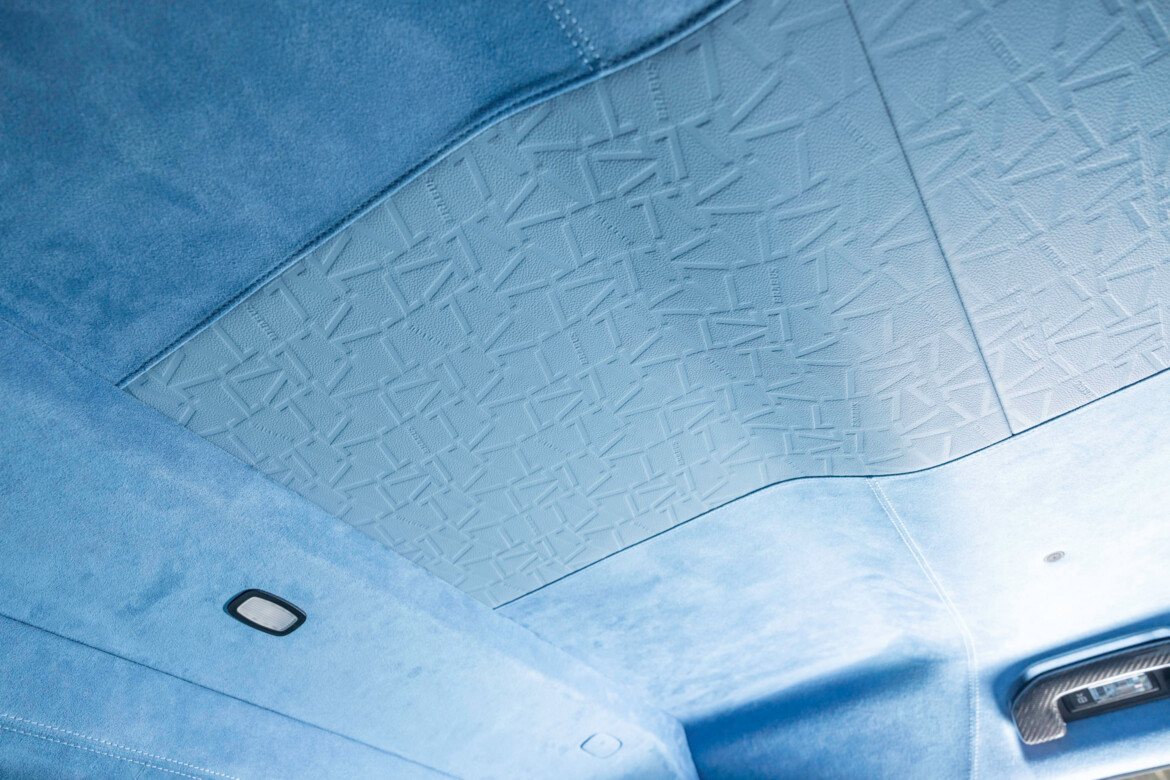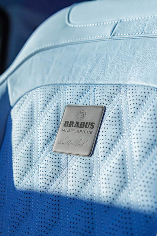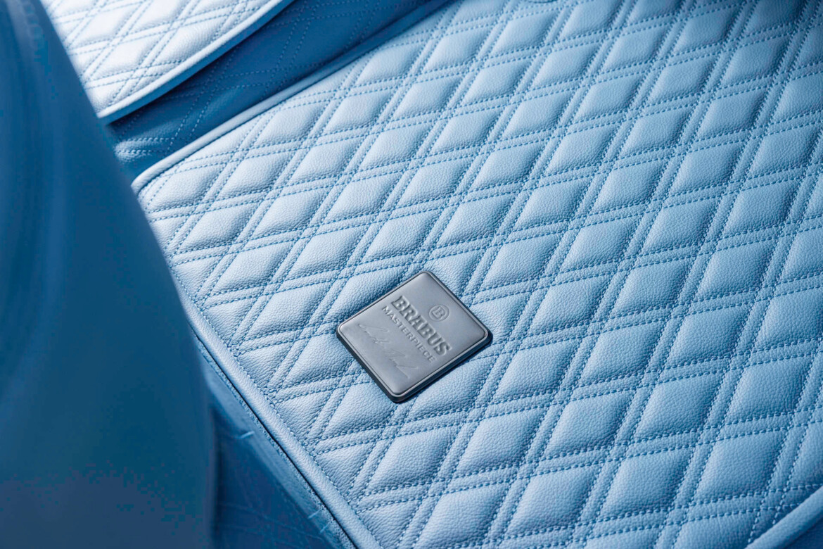 | BRABUS fine leather "SKY BLUE" mit "Double Cube"-Steppung und "77 Heritage"-Prägung. Biesen und Nähte ebenfalls in "SKY BLUE" | |