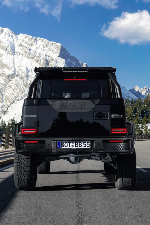 Das Heck wird durch die BRABUS Sicht-Carbon-Schürze geprägt, die wie ihr Pendant an der Front links und rechts perfekt an die breiten WIDESTAR Kotflügel anschließt. Die Tür zur Ladefläche besticht durch eine Sicht-Carbon-Blende mit vertieftem BRABUS Schriftzug.