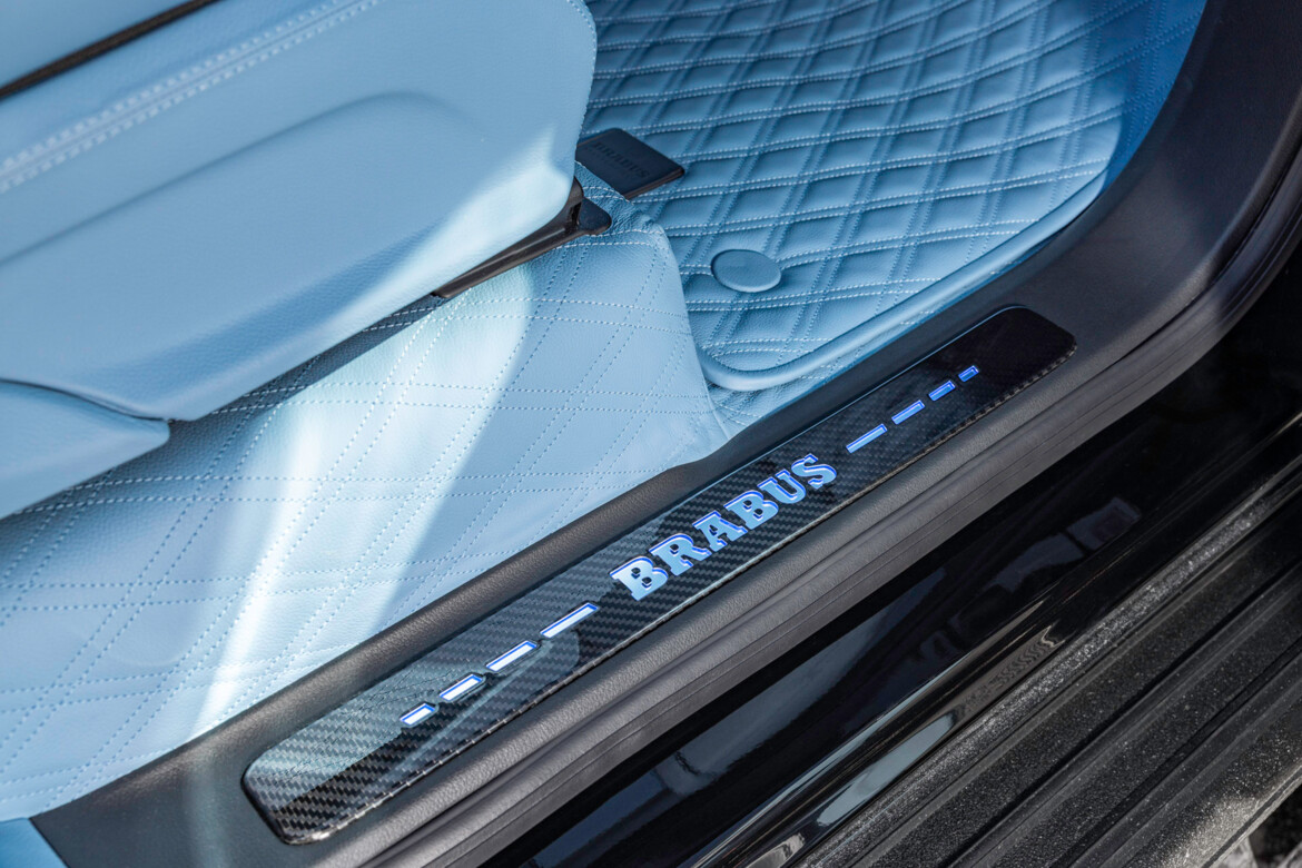 Eine Auswahl an Carbon-Elementen im Innenraum schafft eine perfekte Balance zwischen Eleganz und Sportlichkeit. Von den BRABUS Pedalauflagen bis hin zu Teilen des Lenkradkranzes, der Armaturenbrettverkleidung, der Türverkleidungen und der Mittelkonsole verleiht jedes Detail dem Innenraum einen außergewöhnlichen 1-Second-Wow Effekt. Die Carbon-Einstiegsleisten an allen vier Türen sorgen für einen zusätzlichen Touch von Exklusivität. Sie sind mit einem hintergrundbeleuchteten BRABUS Logo versehen, das seine Farbe synchron mit der Ambientebeleuchtung ändert. Die Cockpit-Bedienelemente, Lüftungsdüsen, Lautsprechergitter und verschiedene Zierelemente sind in BRABUS „Shadow Chrome“ ausgeführt.